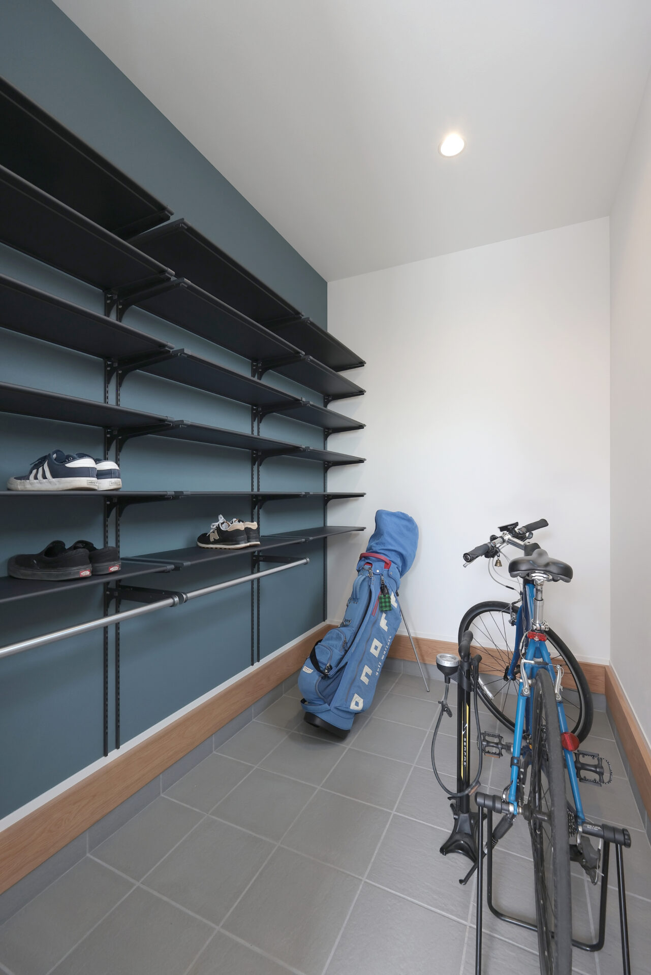 また、土間収納には棚板を多く設置したため、クロスバイクやゴルフバッグを置いてもまだ余裕があり、とても使いやすい空間になっています。