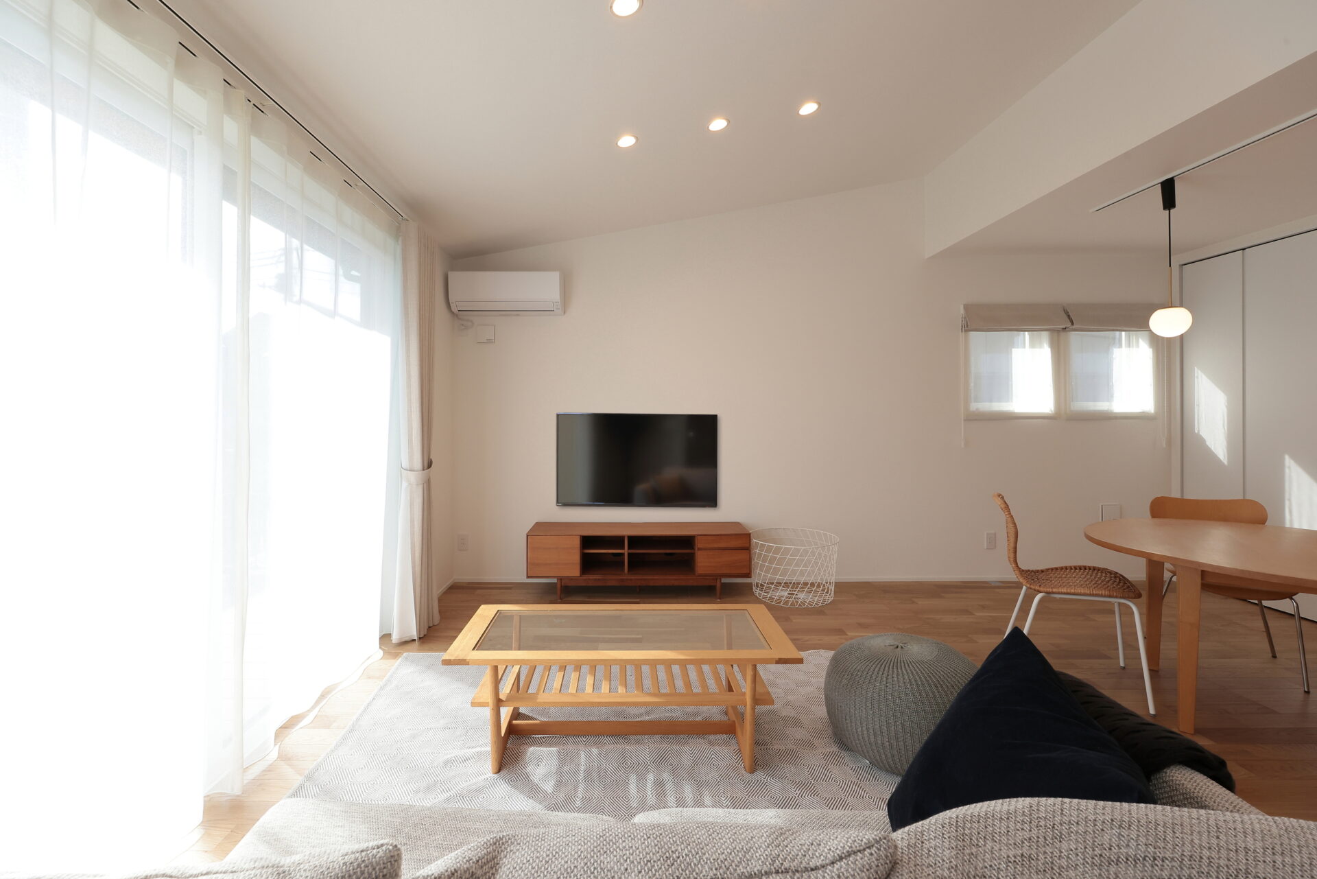 お子様が走り回っても圧迫感がなく、ソファに座っていても、床に寝転んでも、開放感を楽しめるリビングです。