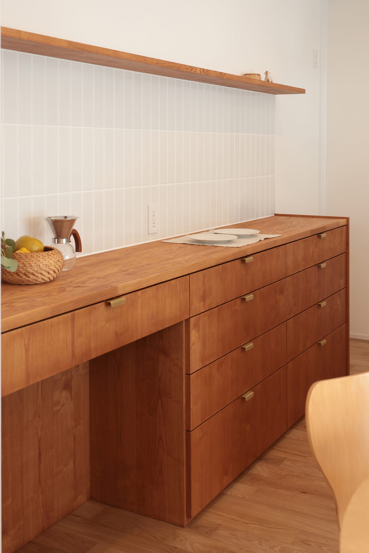 造作のカップボードは木材をふんだんに使い、まるで家具のような存在感に仕上げました。